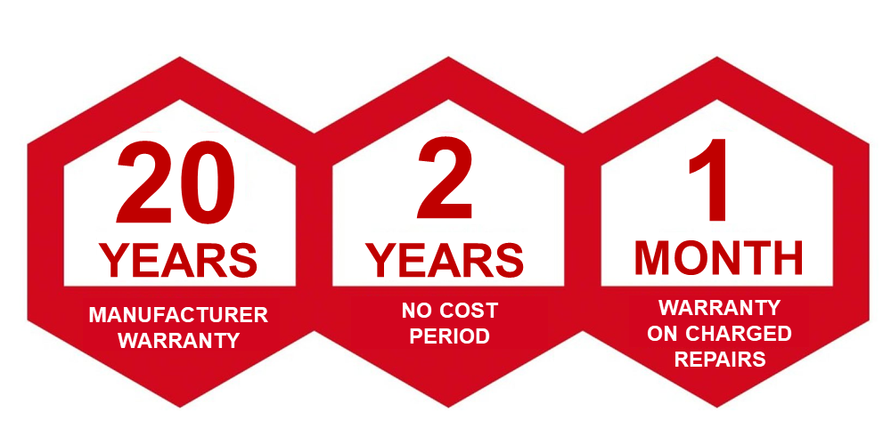 - 20 years manufacturers warranty, 2 years no cost period, 1 month warranty on charged repairs